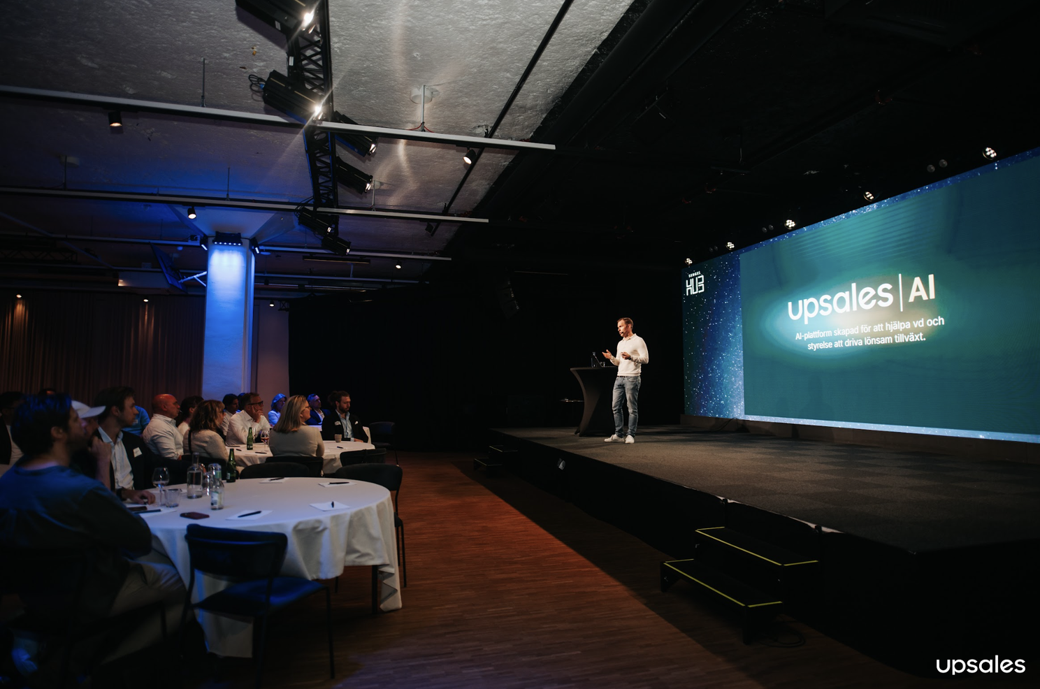 Daniel Wikberg (VD Upsales) tog det ett steg längre och visade hur framtiden ser ut när AI operationaliseras. Traditionella organisationsscheman utvecklas nu och kompletteras av nätverk av AI-agenter med tydliga ansvar, som arbetar sida vid sida med människor.